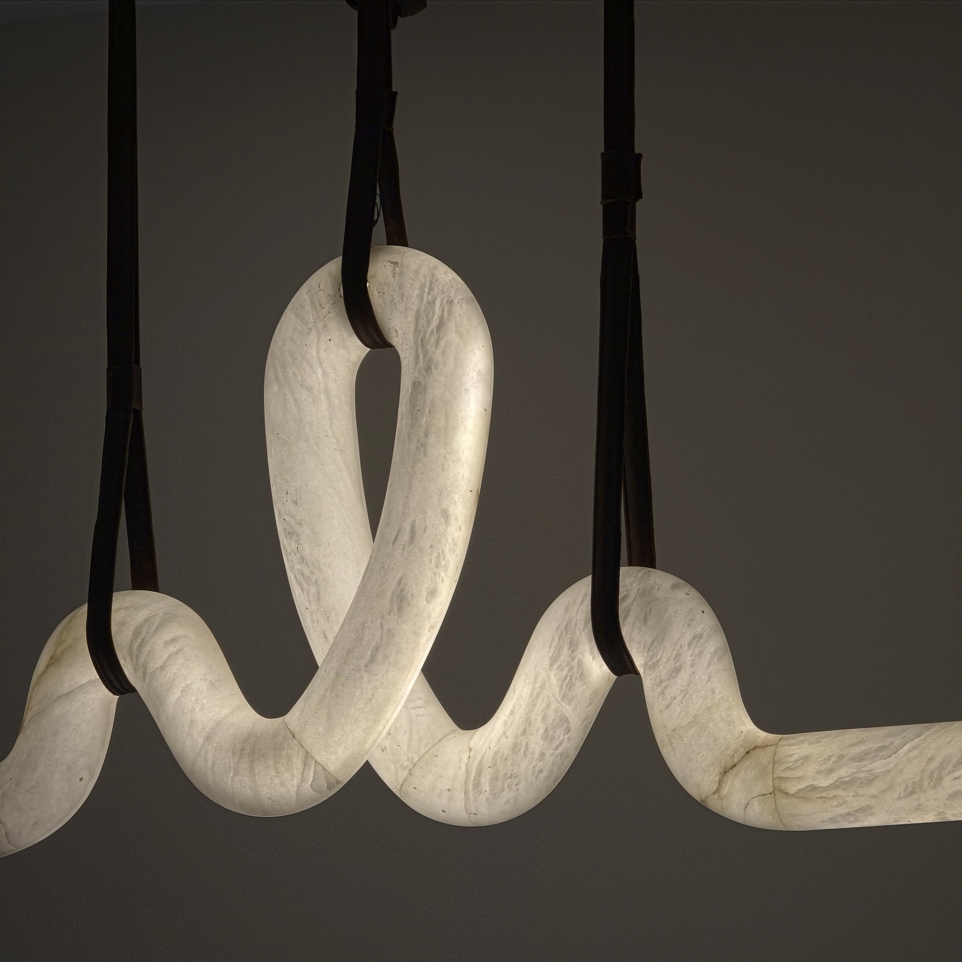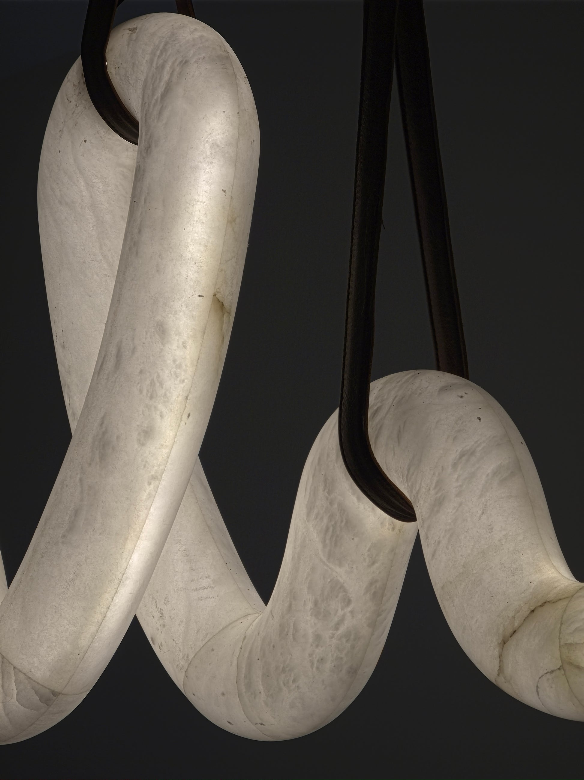 The Signature Pendant was created by Asaad Nashed, a designer known for merging natural stone artistry with contemporary lighting design. Inspired by the graceful motion of handwritten signatures,
