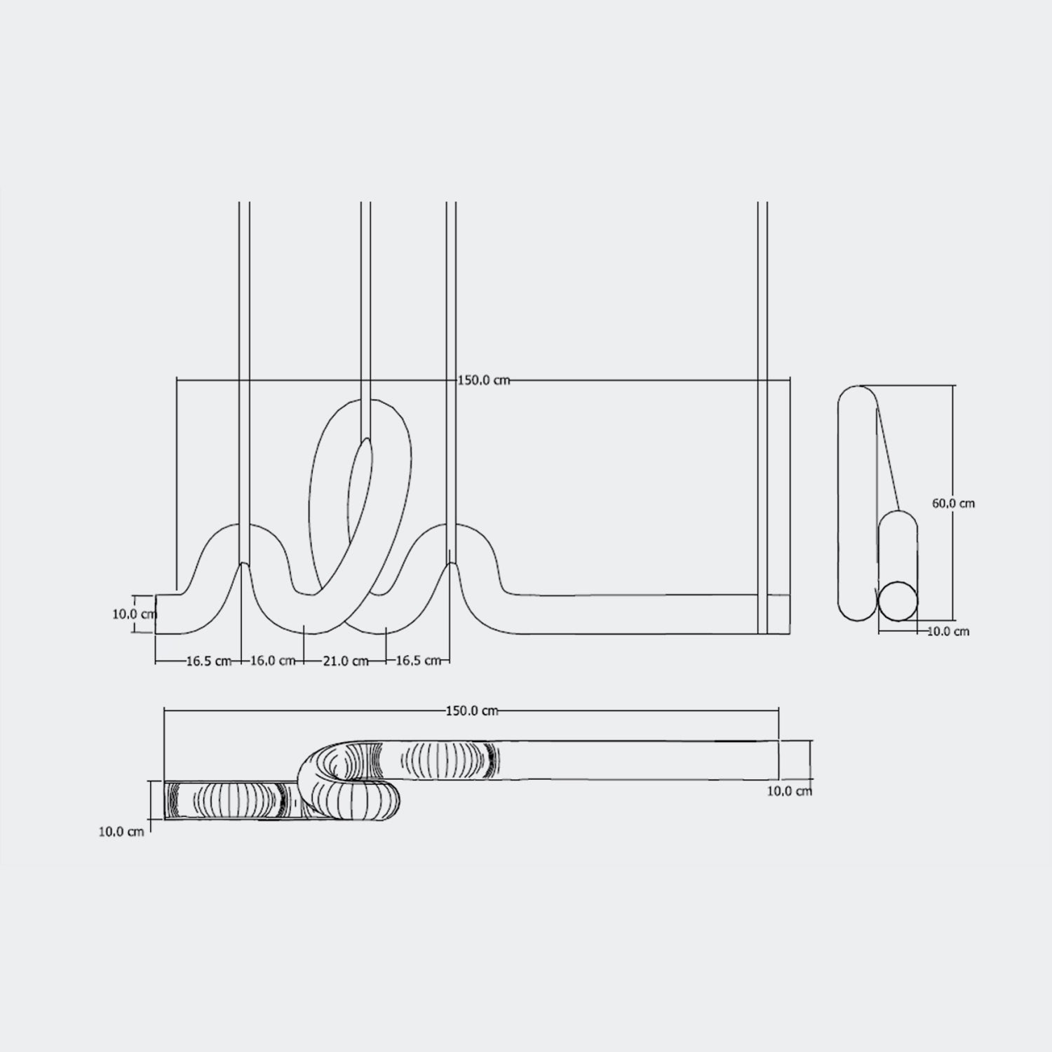 150 × 60 × 10 cm. Designed to command presence while maintaining refined elegance. Suspended on sleek dark metal supports, its flowing form appears to float effortlessly in space.