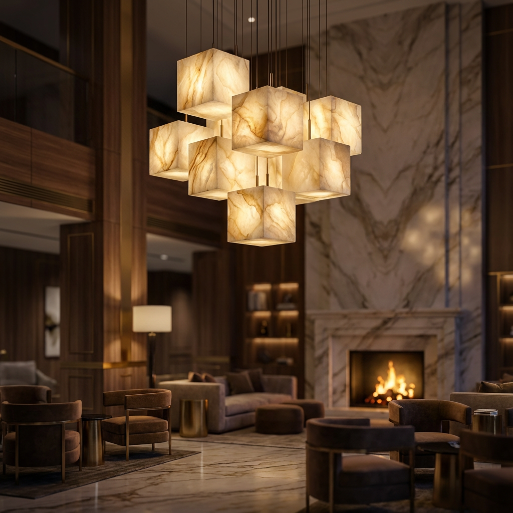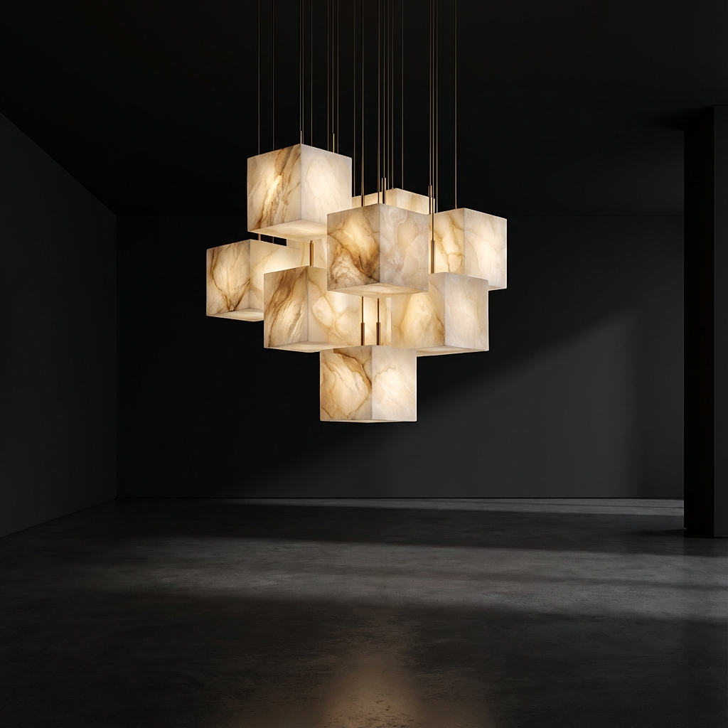 The CUBEN Chandelier transforms the timeless purity of alabaster