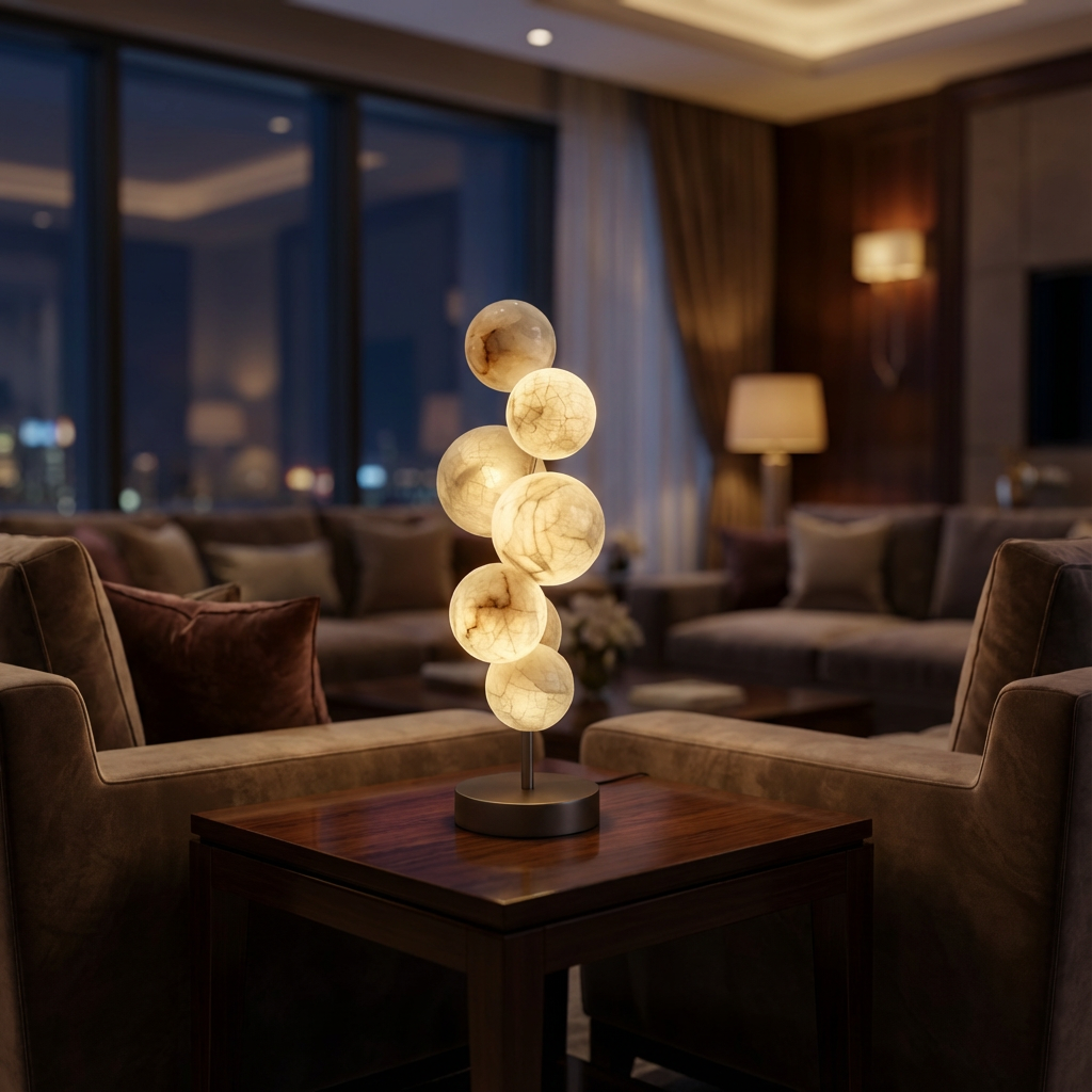 • Crafted from premium natural alabaster, selected for its soft translucency and refined veining.