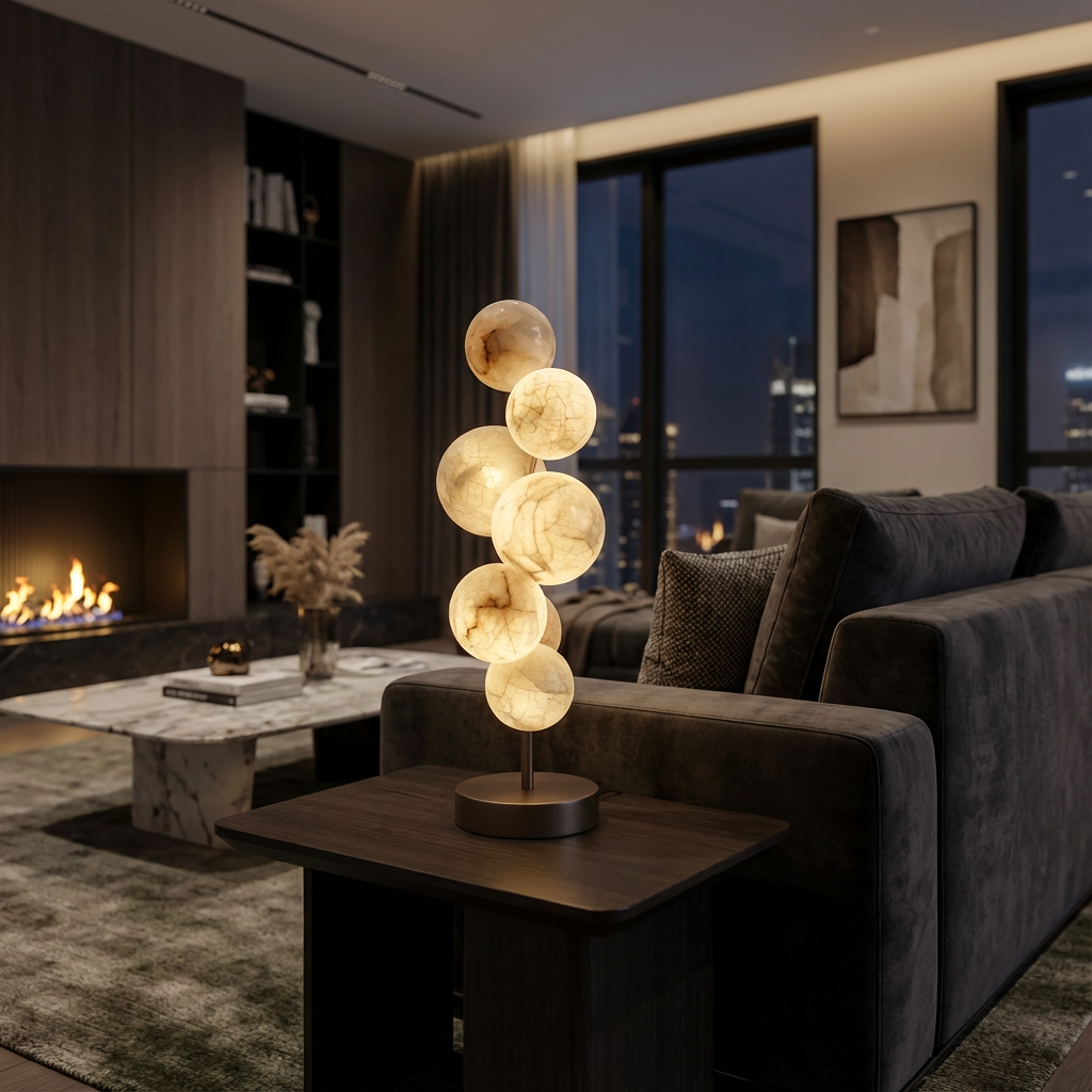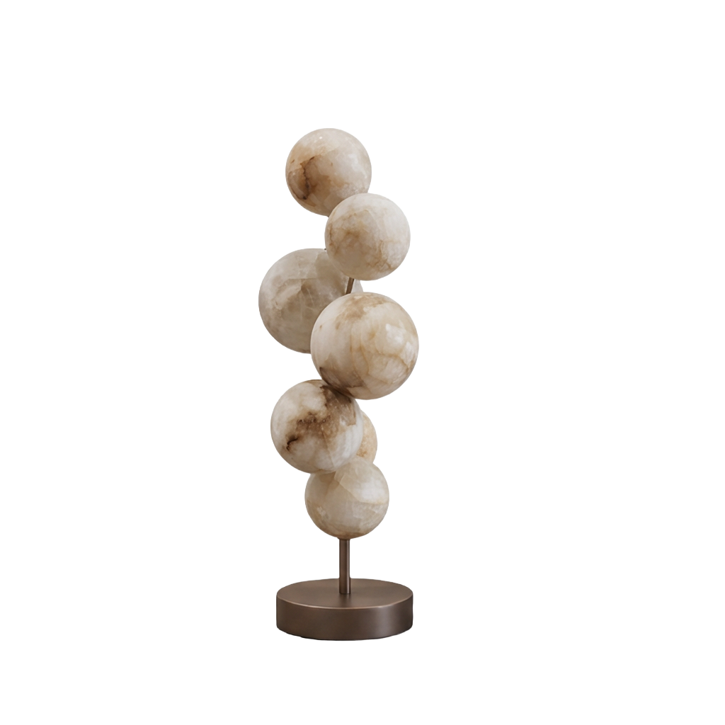 The NECKLACE Table Lamp brings the poetry of alabaster to life in a cascading composition of glowing spheres.